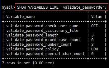 mysql> SHOW VARIABLES LIKE 'validate_password%';